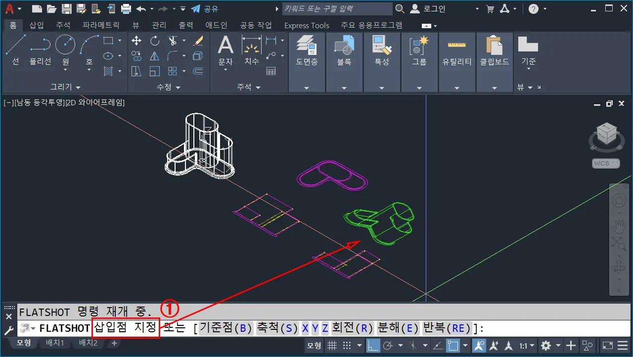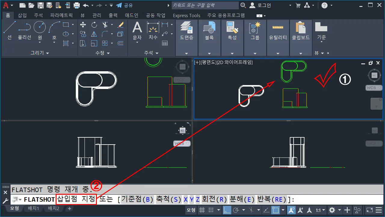 - 캐드 명령 창에서 `flatshot`(기본 단축키 없음, 플랫샷)을 입력하고 엔터 한다.