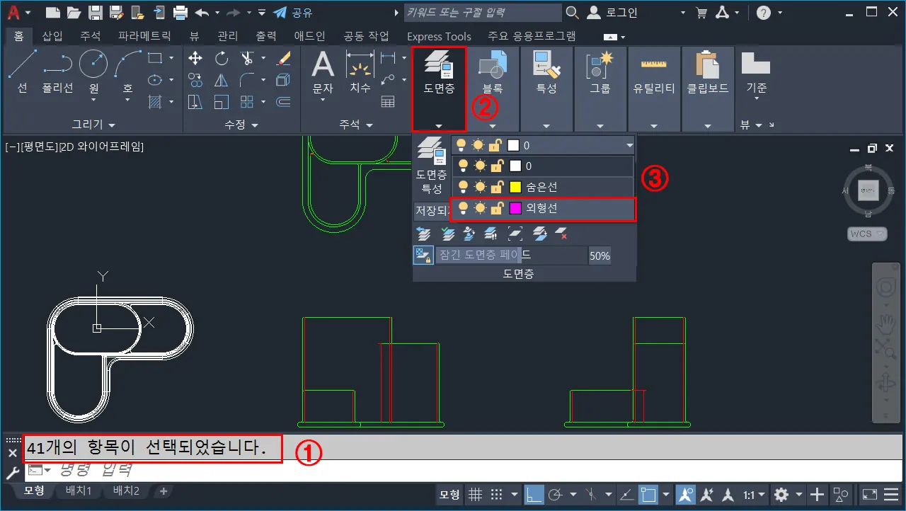 - 우선, 도면층에서 외형선만 남기고, 나머지 도면층은 숨기거나 동결한다.