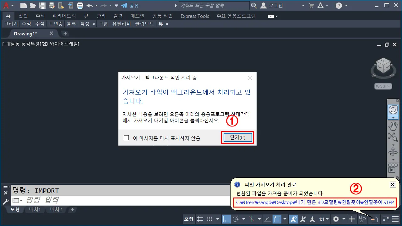 ※ 앞으로 이 창을 보고 싶지 않다면, "이 메시지를 다시 표시하지 않음"을 클릭하고 닫으면 된다. - 백그라운드로 파일 가져오기가 완료되면, 우측 하단에 완료 메시지 창이 나타나고, 나타나는 파일 경로를 클릭하면 외부 파일을 현재 캐드 작업환경에 불러올 수 있다.