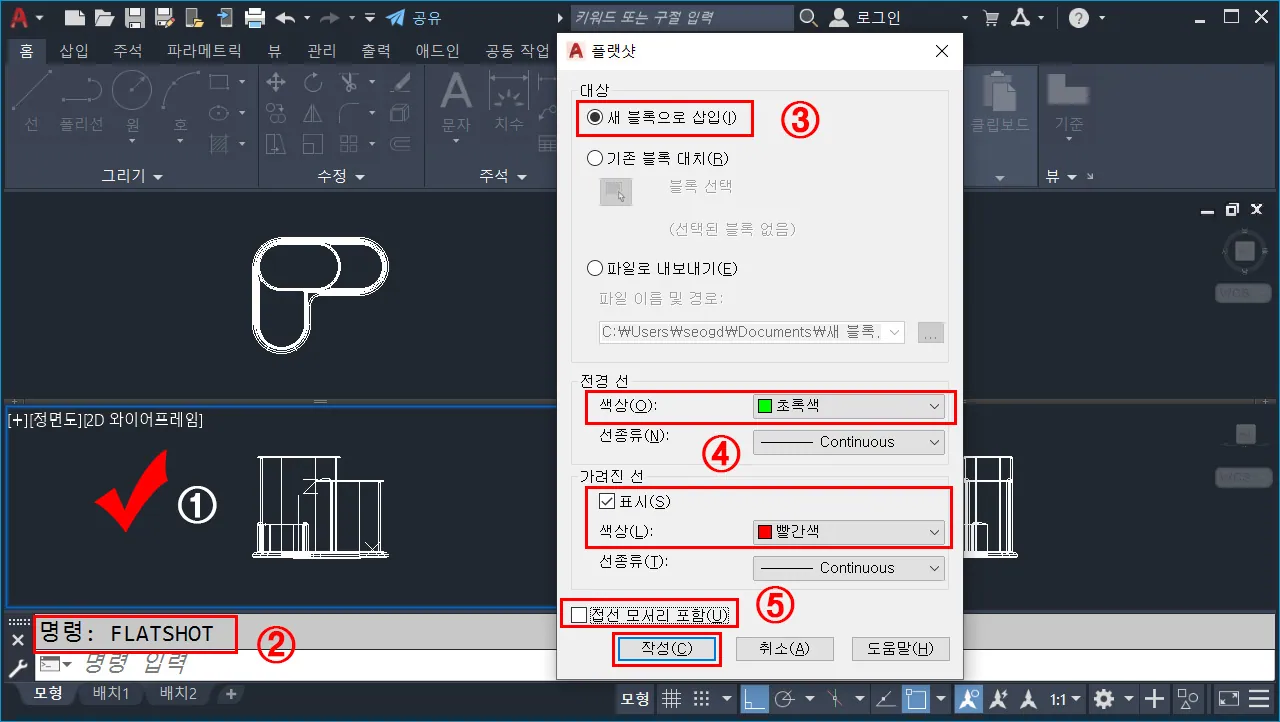 ※ 플랫샷으로 만들어지는 도면은 기본적으로 블록 정의된다. - 전경 선(외형선)과 가려진 선(숨은선, 파선)에 대한 선분 색상을 지정한다.