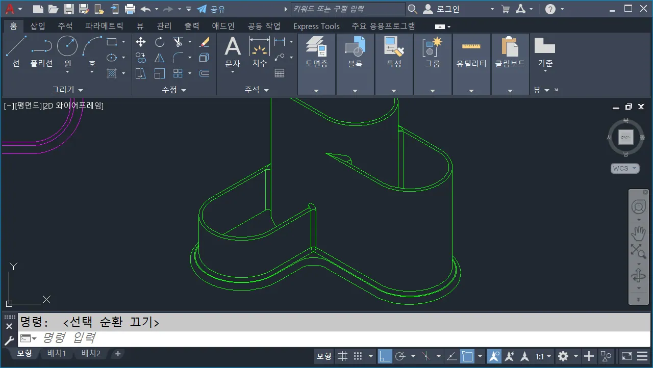 - 명령 창에서 `PLAN`엔터, 엔터 하거나 뷰 큐브에서 평면 뷰를 선택하고, `-vp`엔터 `0,0,1` 엔터 하거나 사용자가 알아서 평면 화면으로 변경하면 된다.