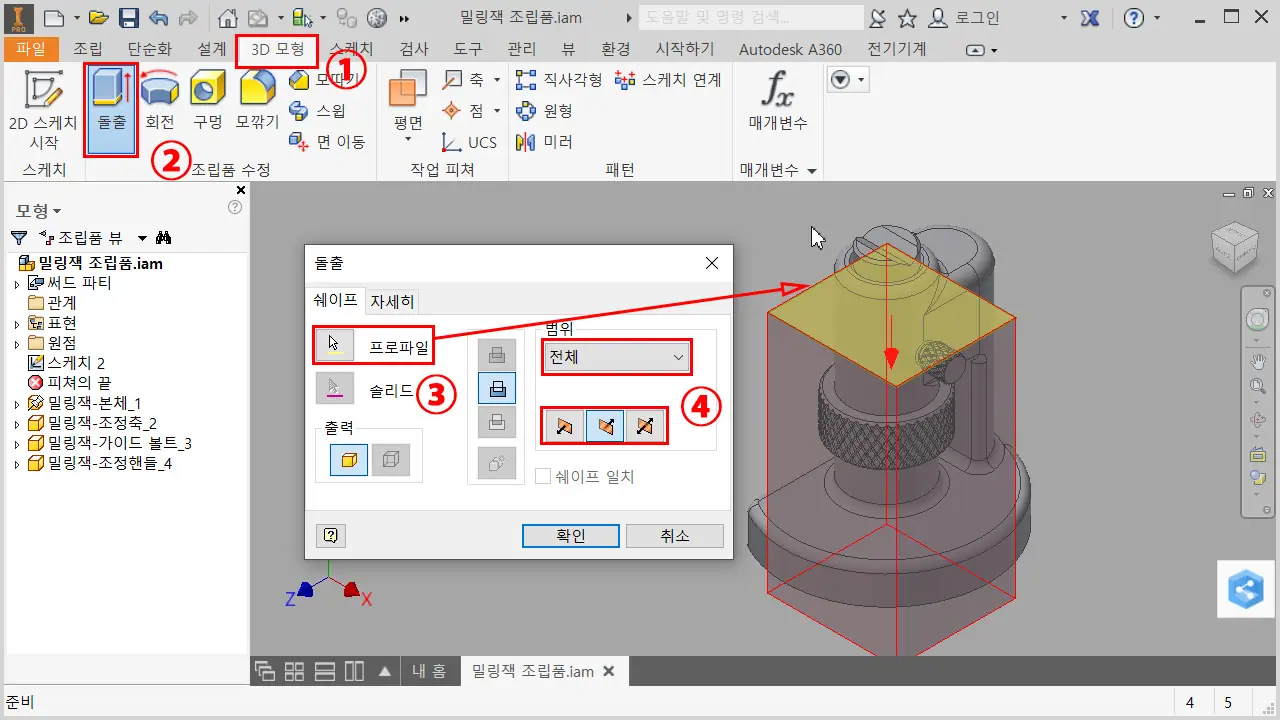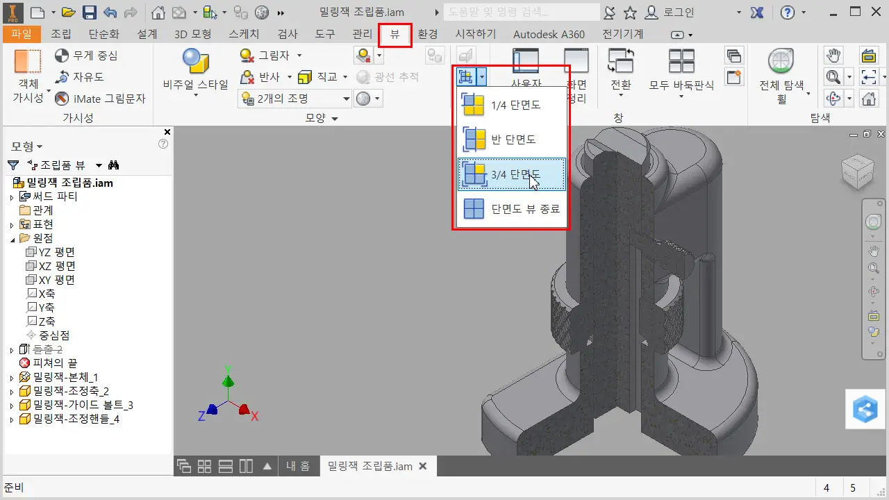 앞에서도 언급했지만, 인벤터 뷰 기능으로는 부분적인 부품 단면 표현이 어렵기 때문에, 조립품에서 제공하는 모형 작성 기능을 이용하여 부품의 일부분을 잘라낸다.