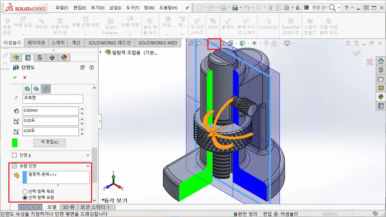 우측 작업화면은 솔리드웍스 조립품에서 기본적으로 제공하고 있는 단면도 작성 기능 중에서 원하는 부품만 단면 지정 또는 해제할 수 있는 기능을 가지고 있어, 특별한 기교가 필요하지 않게 원하는 단면을 구성할 수 있다.