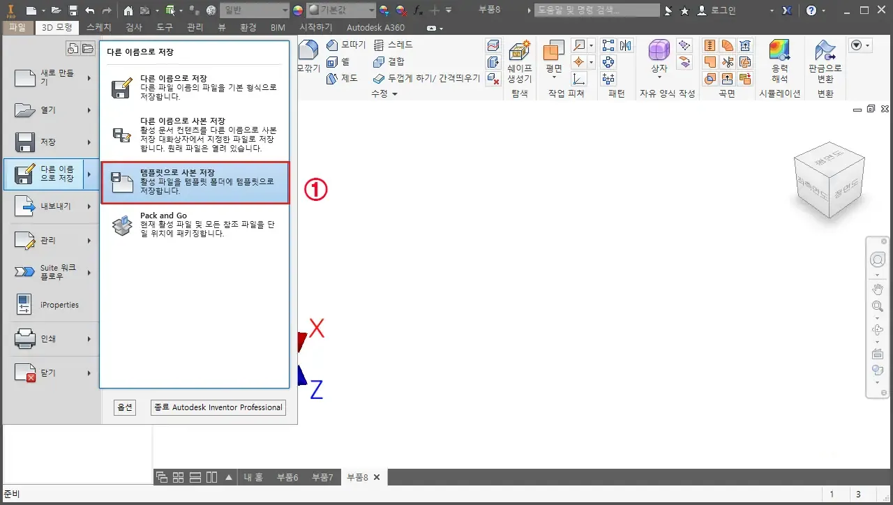 ① 파일 -> 다른 이름으로 저장 -> 템플릿으로 사본 저장을 눌러 현재 화면을 템플릿으로 저장해 두고, 차 후에 새로운 파트 또는 조립품, 프레젠테이션을 생성할 때 사용하면, 일일이 홈 뷰 설정 없이 바로 사용할 수 있다.