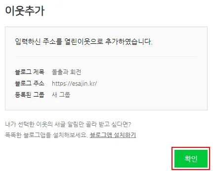 위와 같은 방법으로 열린 이웃을 추가를 완료하면 추가되었다는 확인 메시지를 새창으로 볼 수 있다.