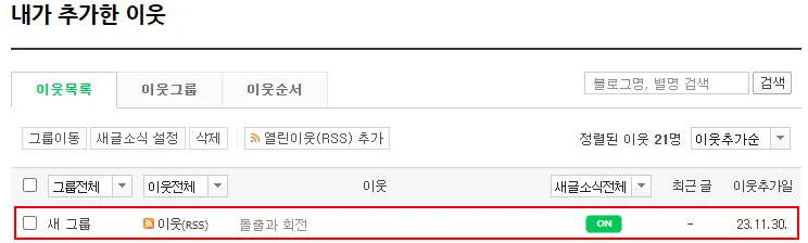 이웃(구독)을 추가하면, 이웃 관리 화면 제일 첫 상단에 새롭게 추가된 이웃 리스트를 볼 수 있으며, 네이버 블로그가 아닌 타사 블로그 서비스는 최근 글의 일자는 보이지 않는다.