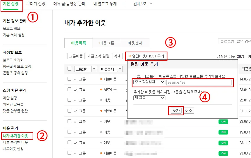 ③ 열린 이웃(RSS) 추가를 클릭한다.