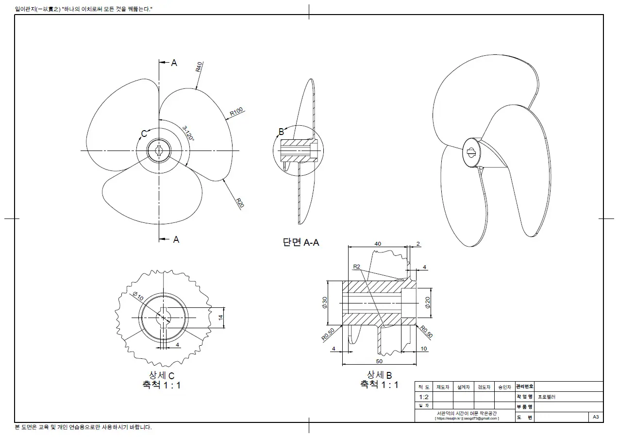 프로펠러를 3D 캐드에서 모델링하는 방법은 여러 가지 있지만, 이번 도면은 코일을 이용한 프로펠러 모델링 또는 작도 연습용 도면이다.