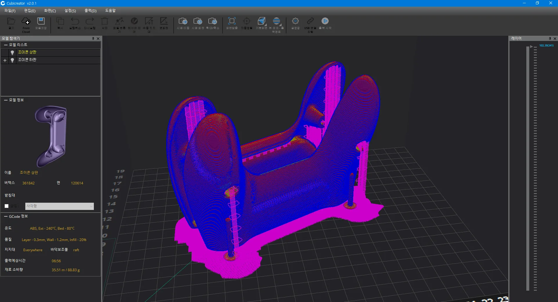 위 세팅은 조금은 빠른 신간에 안전하게 출력하기 위한 세팅 값이고 조이콘 싱글 그립을 출력하기 위한 세팅이기 때문에 참고만 하면 된다.