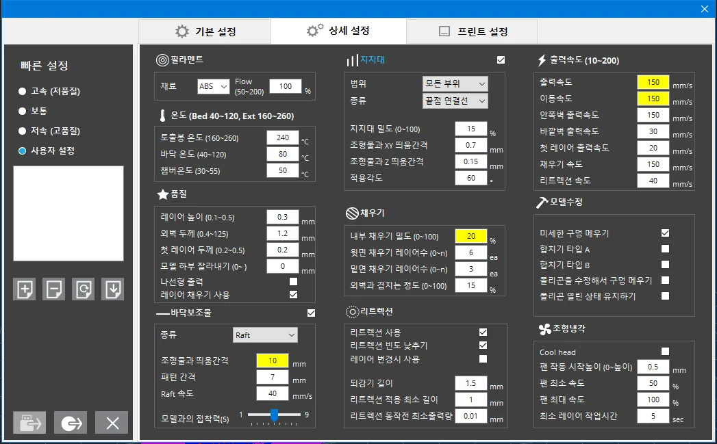 3D 프린터 출력을 위한 각종 설정 값을 상황에 맞게 세팅한다.