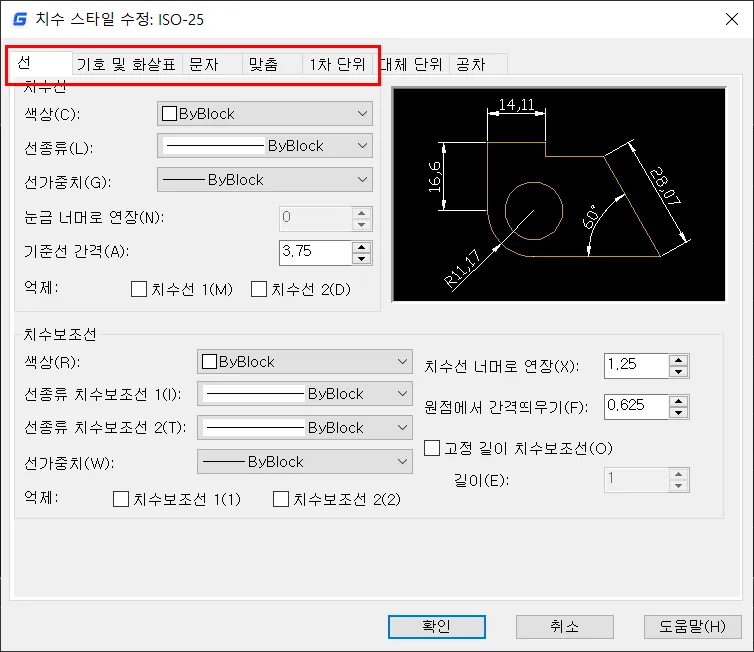 선 (치수 및 치수 보조선) 스타일 탭