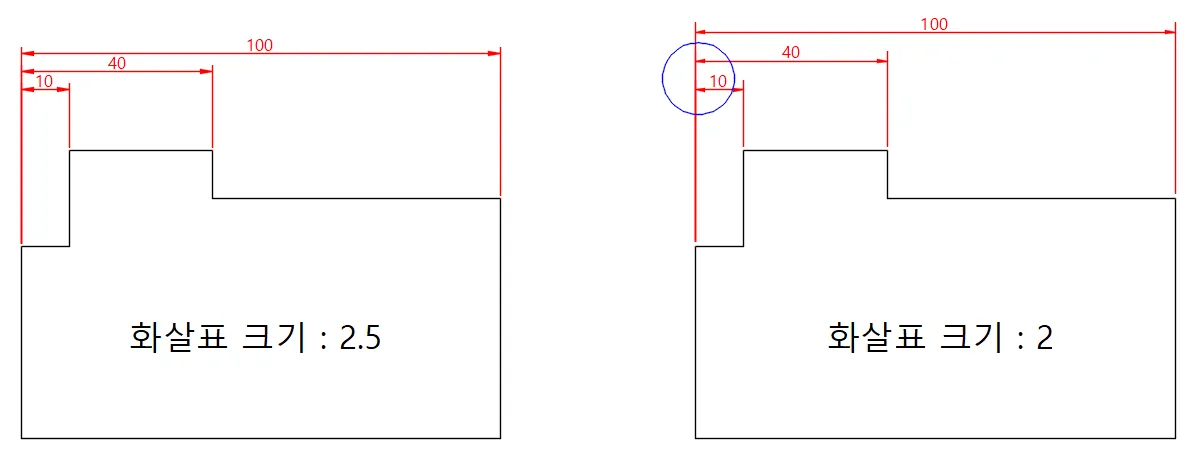 치수선 및 지시선 끝에 붙는 화살촉 아이콘의 크기를 지정한다.