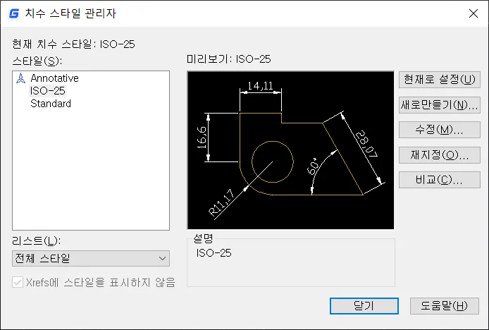 - 치수 스타일 관리자 대화 상자의 스타일 목록에서 `ISO-25`를 선택한다.