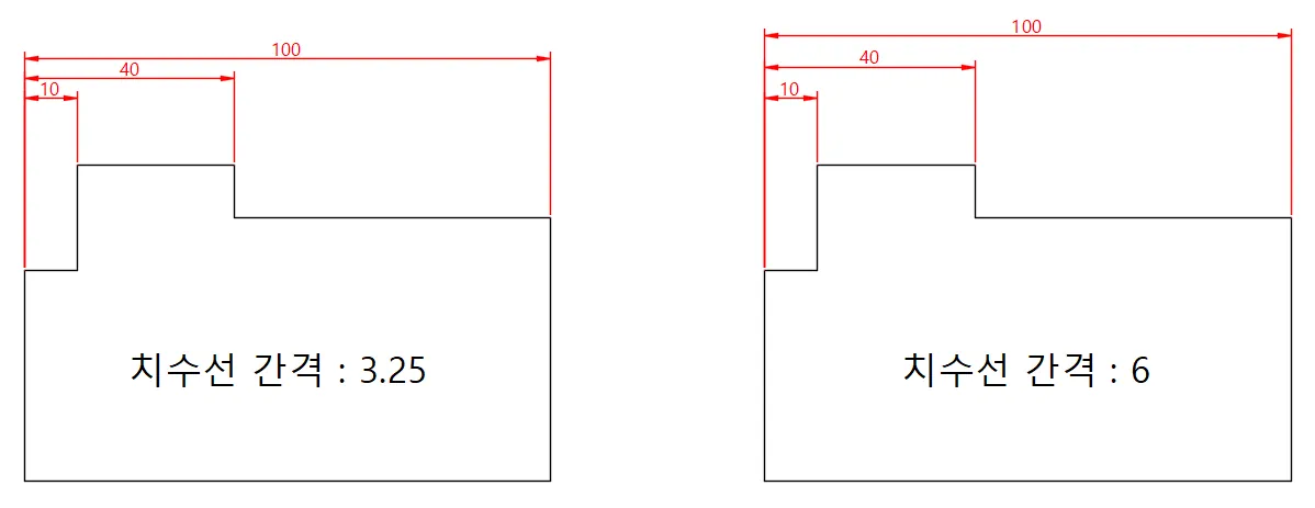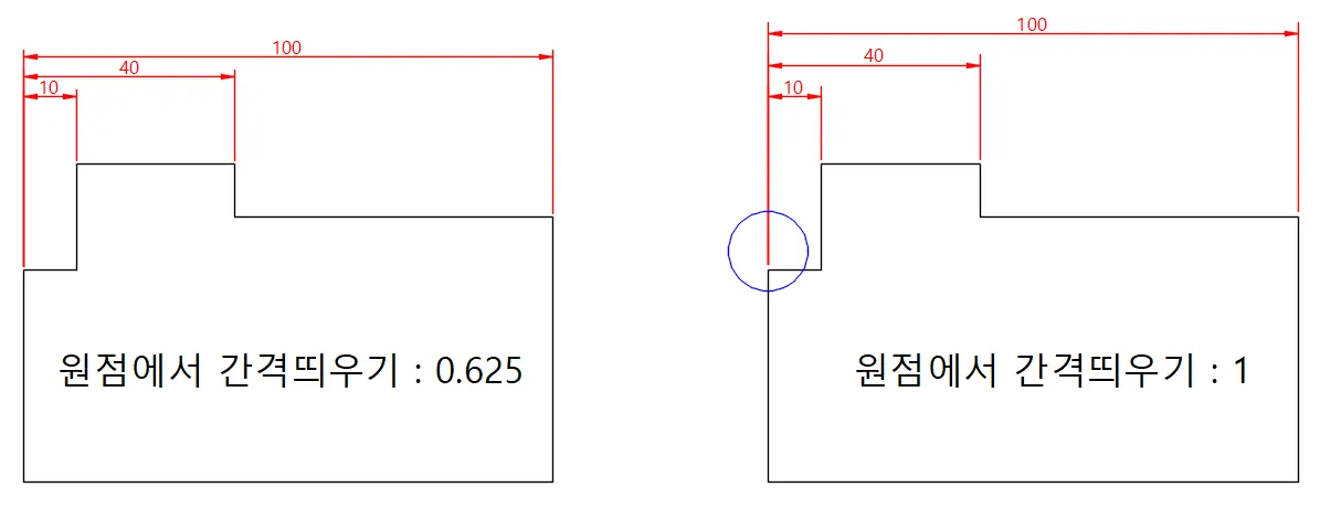 치수 기입 시 지정하는 기준점과 치수 보조선이 시작하는 선분 간격 값을 변경한다.