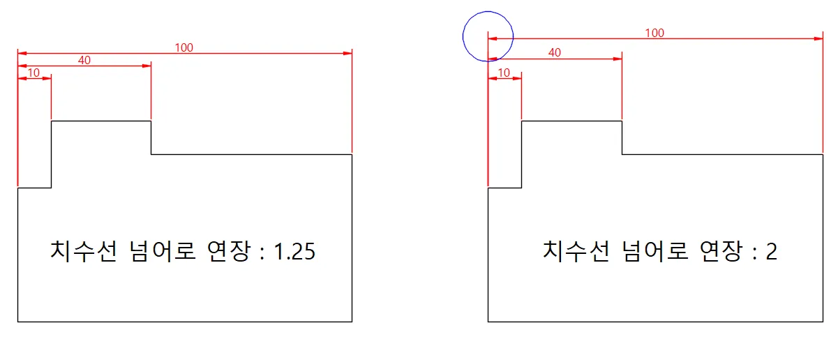 치수 보조선이 치수선 위로 올라오는 선의 길이를 변경한다.