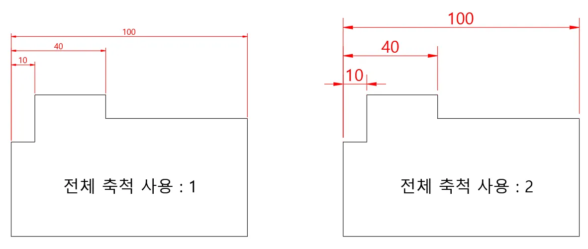 예를 들어, 스케일 명령으로 `2배` 키웠다면, 축척 측정 비율을 `1/2` 또는 `0.5`로 입력 후, 치수 기입하면 스케일 적용 전의 크기로 치수 기입되는 것을 알 수 있다.