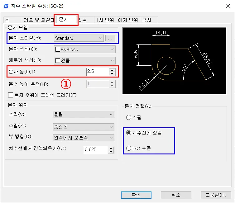 기타, 문자 배치는 특별한 사항이 아니면, 변경할 이유는 없을 것이고, 문자 정렬에서 치수선에 정렬과 ISO 표준은 차후, 지름/반지름 치수 기입 후, 필요한 부분만 변경할 수 있도록 한다.