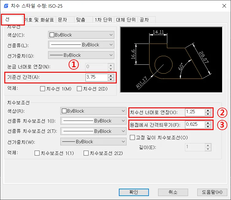 선은 치수선과 치수 보조선에 대해서 세부적으로 설정하는 곳이지만, 목적과 상황에 따라 설정의 내용도 달라진다.