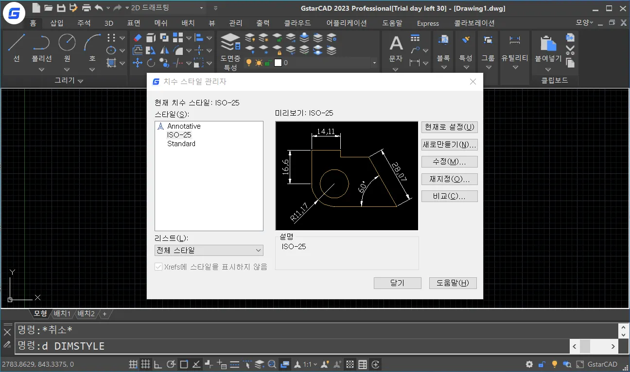 - `ISO-25`는 기본으로 설정된 현재 치수 스타일로, `ISO제도 규격`에 맞게 일차적으로 설정된 치수 스타일이다.
