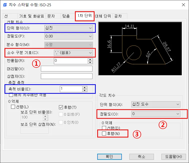 치수 스타일 수정에서 빨간색 테두리는 우선 수정해야 되는 사항이며, 파란색 테두리는 차후, 수정을 결정해야 되는 사항이다.