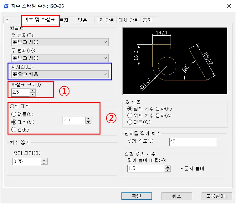 기호 및 화살표 스타일은 치수선 또는 지시선 등에 기호와 각종 치수 요소의 크기를 변경하는 곳이다.