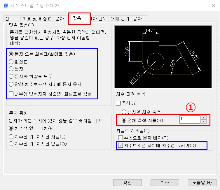 맞춤 탭 영역은 화살표 및 문자의 맞춤 위치나 문자의 위치에 따른 치수선 표시 유무, 치수 위치 등을 변경하는 부분이다.