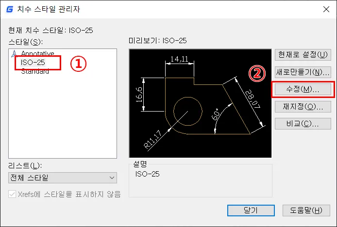 - 치수 스타일 관리자 대화 상자의 스타일 목록에서 `ISO-25`를 선택한다.