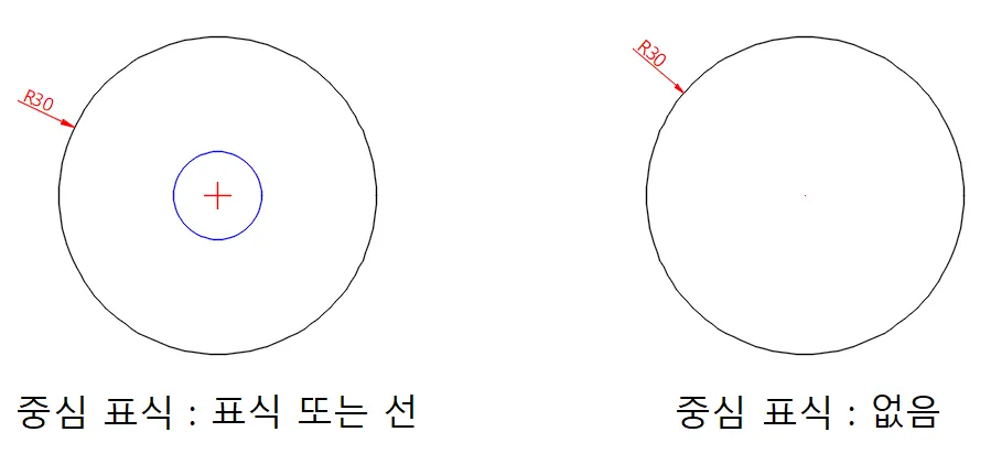 원, 호에 지름/반지름 치수 기입 후, 내부 치수 보조선을 숨기는 경우에 자동으로 중심선을 표시할 것인지를 결정한다.