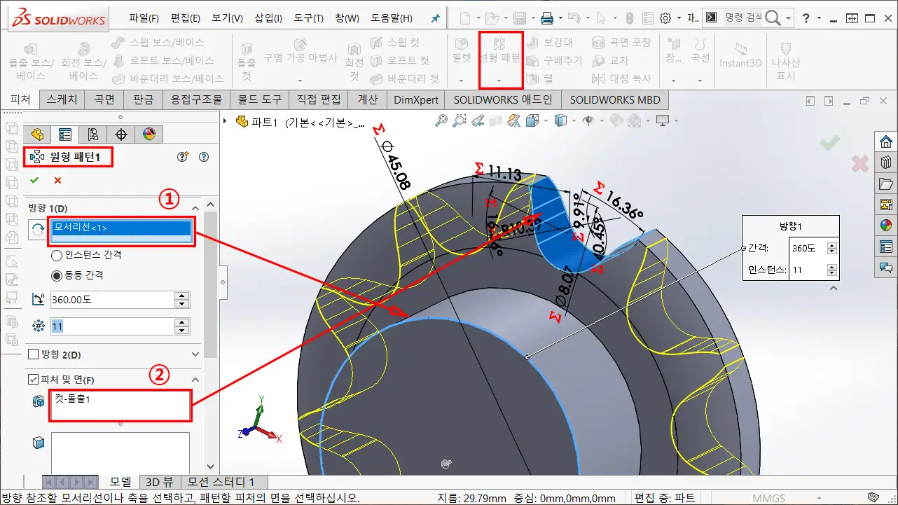 ② 원형 패턴 할 피처를 돌출 컷 한 영역을 선택하거나, 피처 리스트에서 돌출 컷을 선택하고, 원형 패턴을 완성한다.