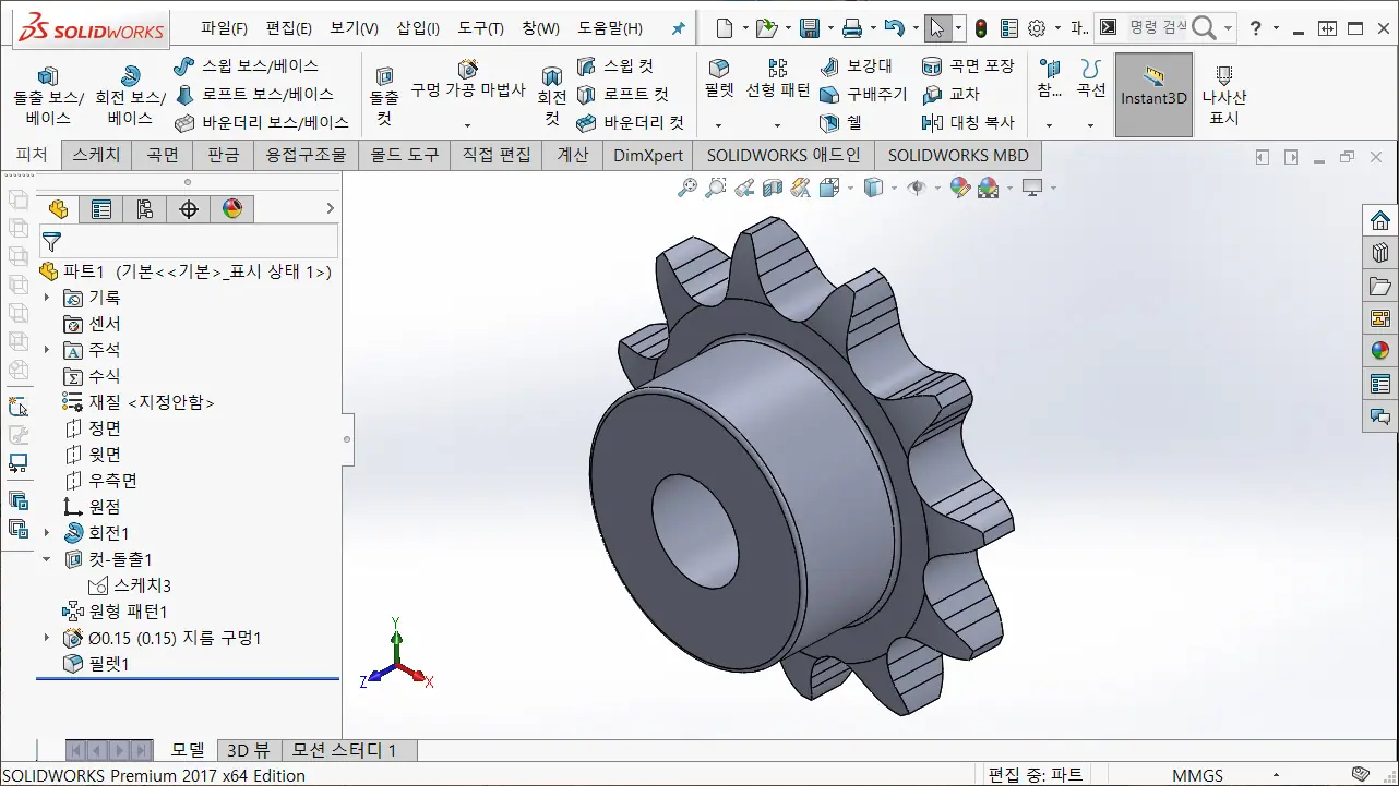 여기까지 기본적으로 스프로킷 휠 치형 모델링하는 내용이다.ㅋ