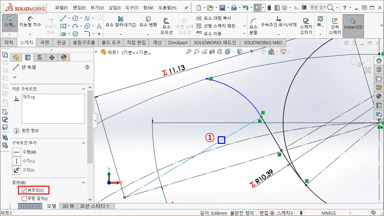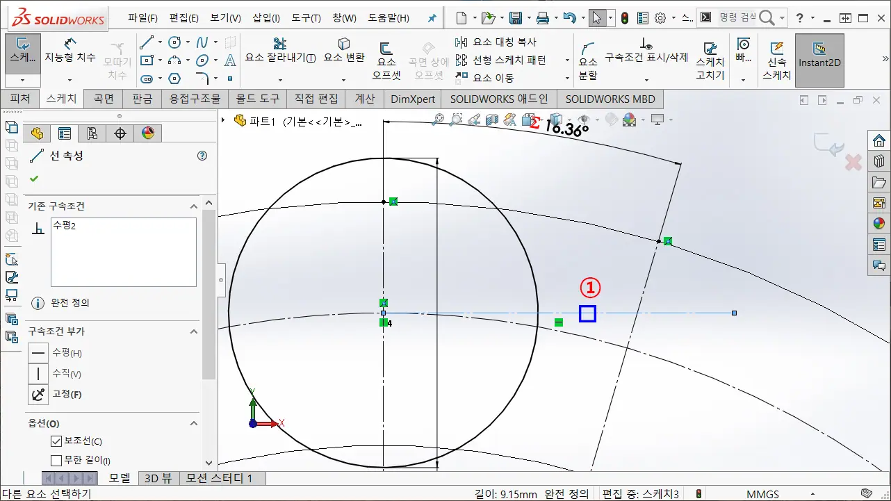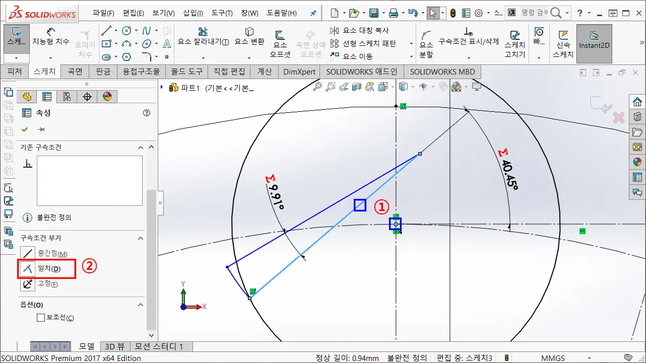 ※ 인벤터에서는 원호와 점을 선택해서 동심(중심) 구속 기능이 없는 걸로 알고 있기 때문에 인벤터로 구속하고 한다면, 호의 중심점과 선분의 끝점을 일치 구속한다.
