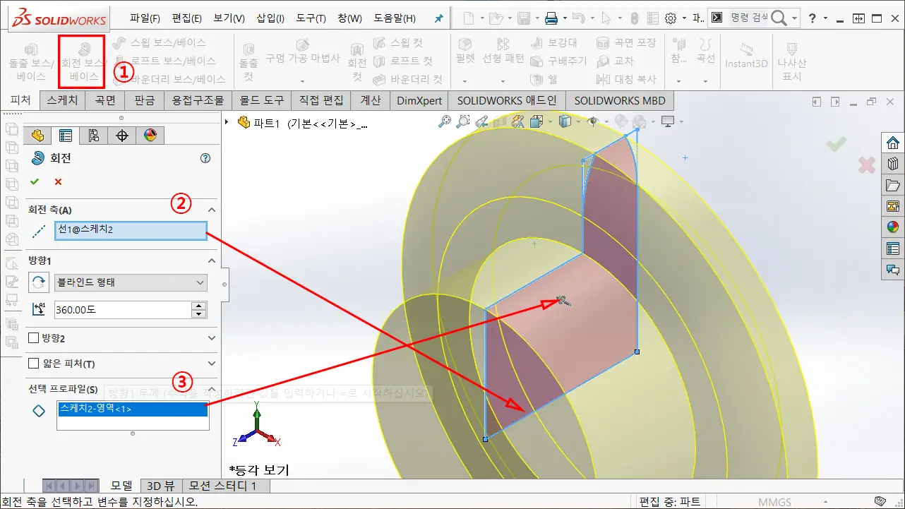 ③ 회전 단면은 스케치 내부를 선택하여, 360도 회전한다.