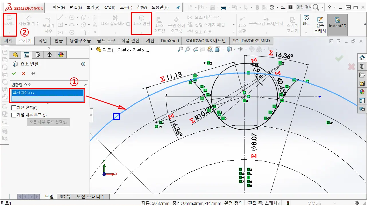 솔리드웍스에서 2-15까지의 작업은 열려있는 상태의 스케치이기 때문에, 닫힌 영역을 만들기 위해서 스프로킷 휠의 가장자리를 요소 변환(형상 투영)하여 닫힌 영역을 만든다.