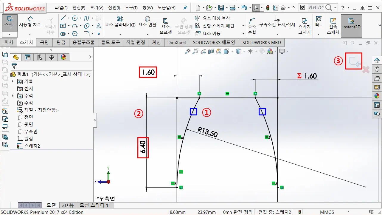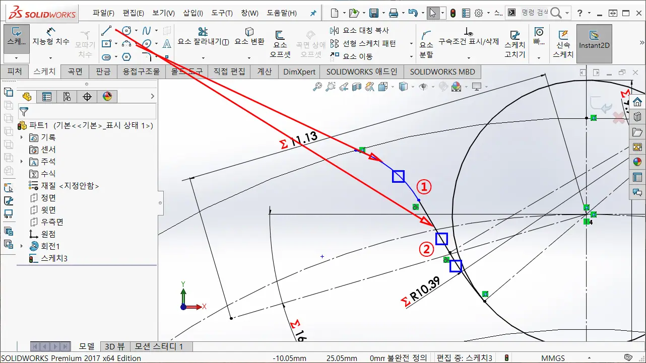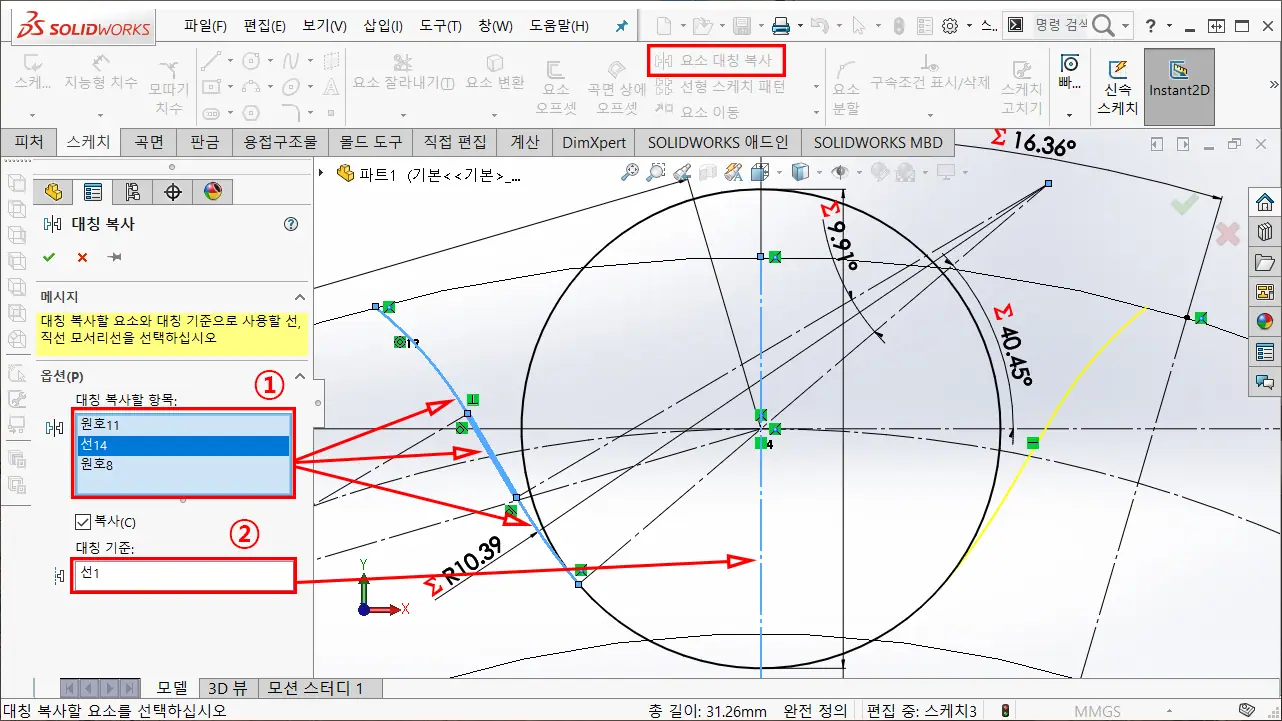 ① 스케치 요소 대칭 복사를 이용하여, 대칭 복사할 항목 2-13에서 작성한 선과 호를 선택한다.