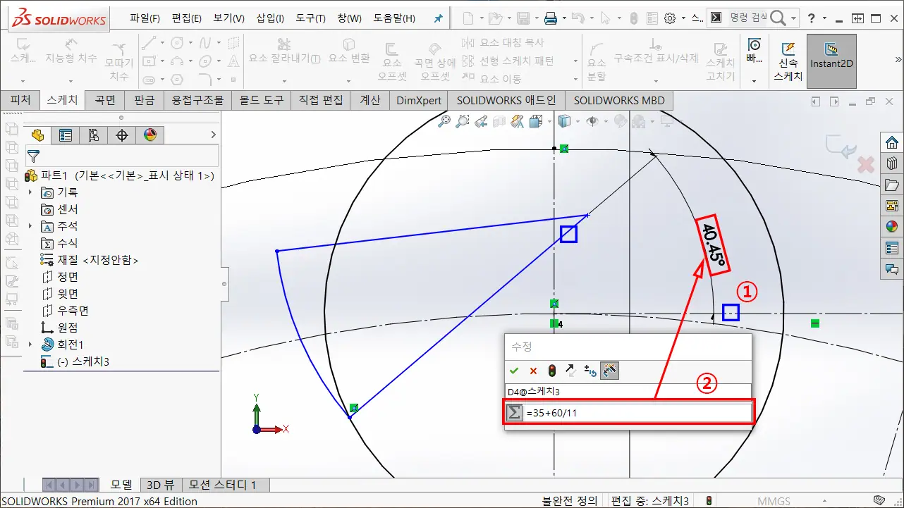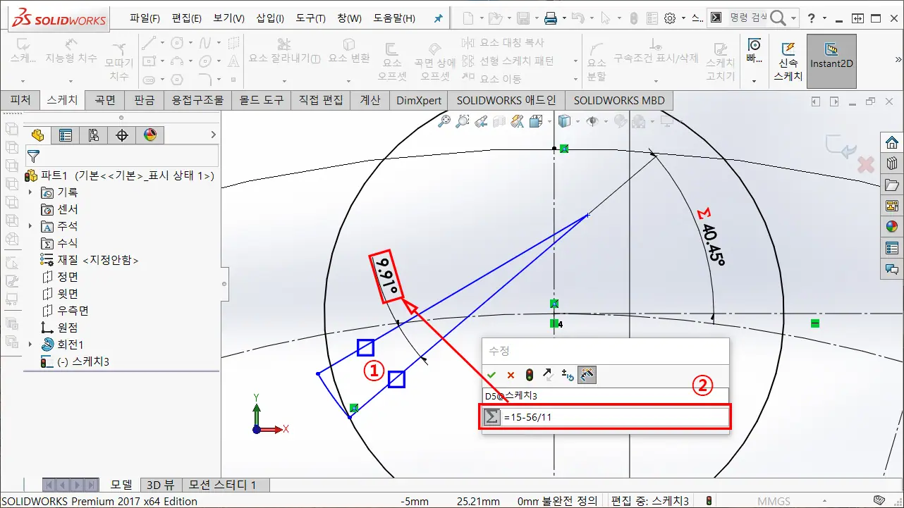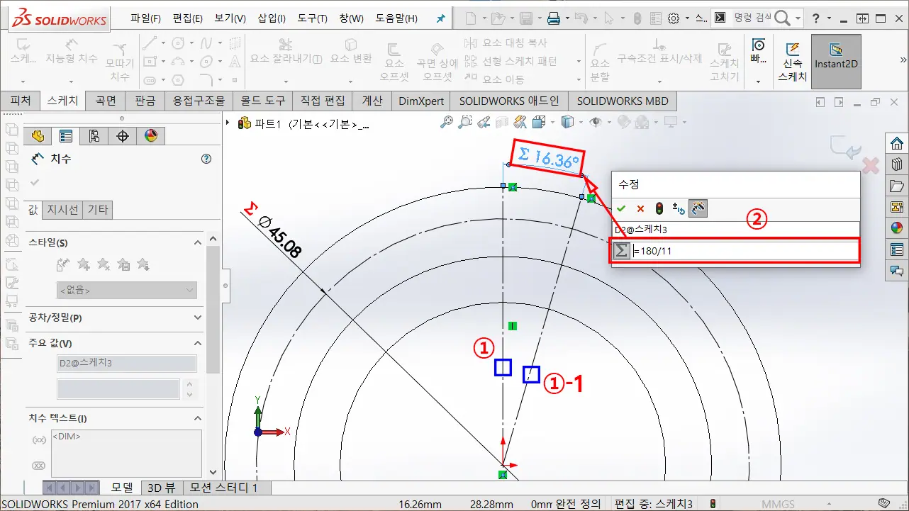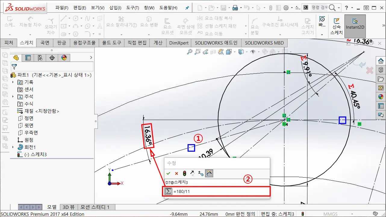 ② 피치 각도 공식은 "360° / 잇수(N)"이며, 하프 각도는 "180° / 잇수(N)" 임으로, 치수 수식 입력창에 =180 / 11을 입력하여 각도 구속한다.