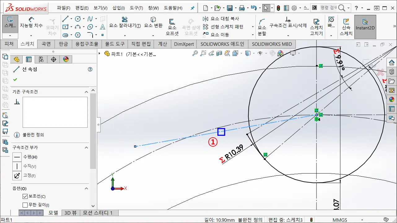 ② 2-10에서 작성된 호와 금방 작성한 선분을 선택하고, 접선(탄젠트) 구속하고, 이어서 금방 작성한 선과 호를 선택하여 접선(탄젠트) 구속한다.