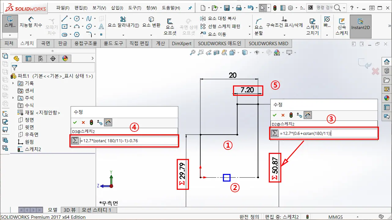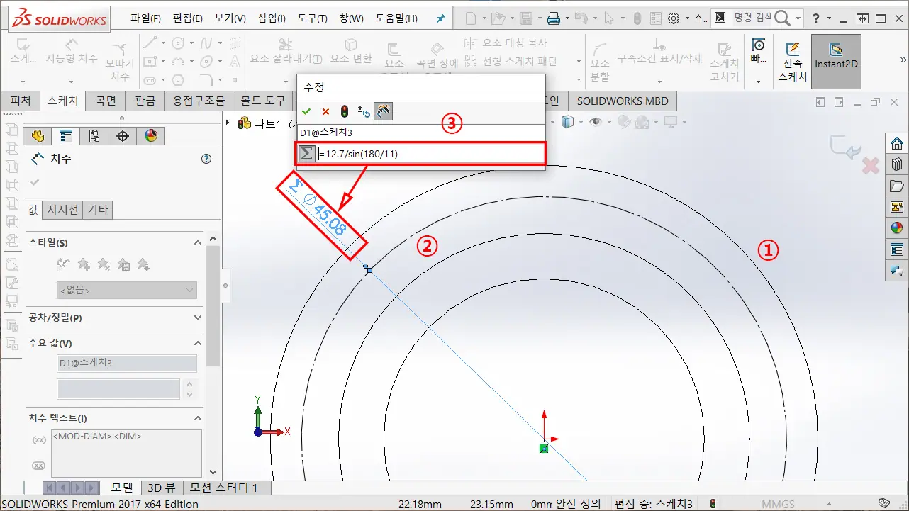 ③ 치수 구속을 이용하여 피치원 지름 공식은 "피치 / sin(180 / 잇수)" 임으로, 수식에 =12.7/sin(180/11)을 입력하여 원을 구속한다.