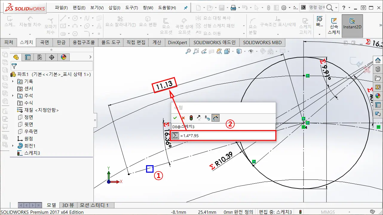 ① 지능형 치수로 c-x, c-y 사이에 작성된 호를 선택하고, E에 해당하는 공식은 "E = 1.3025 * 체인 롤러 외경(Dr) +0.038" 임으로, 치수 값에 수식은 =(1.3025 * 7.95) + 0.038을 입력하여 반지름 치수로 구속한다.