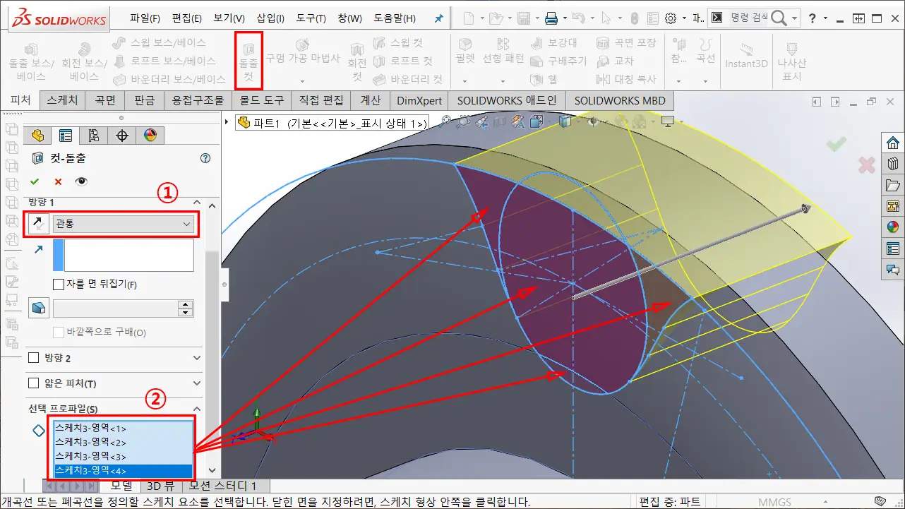 ① 돌출 컷을 클릭하고, 돌출 방향을 관통으로 설정한다.