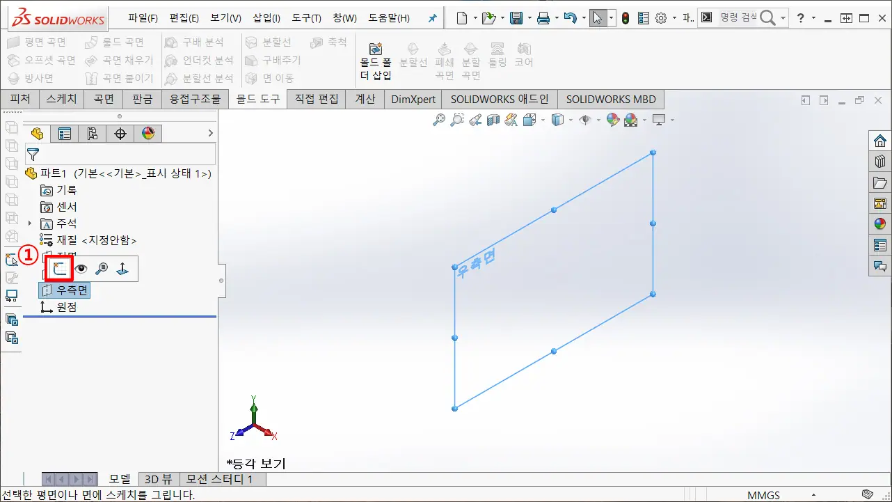 ① 솔리드웍스에서는 우측면을 기준으로 기준 스케치를 시작하고, 다른 툴 사용자는 측면에서 시작할 수 있도록 평면을 선택하여 스케치를 작성한다.