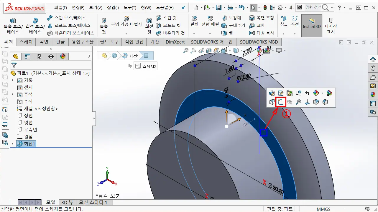 ① 피처 메뉴 탭에서 회전 보스/베이스를 클릭한다.