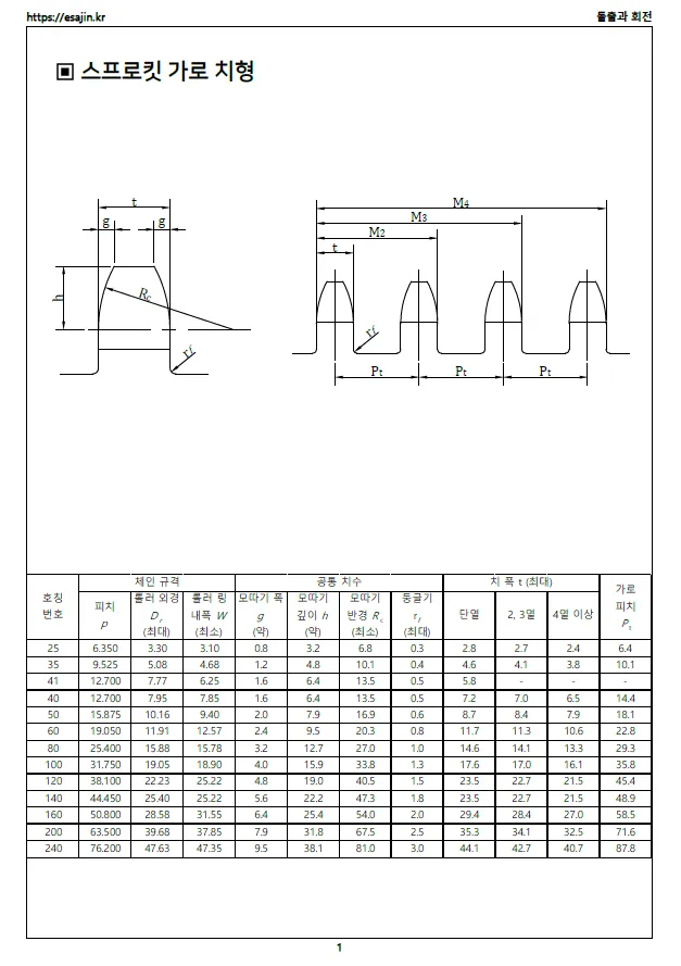 스프로킷 휠은 체인이 미끄러지지 않도록 절삭된 이빨에 의해 구동하는 기계 요소이며, 규격 공식을 적용하여 제도 또는 모델링하는 방법에 대해서 알아보자.
