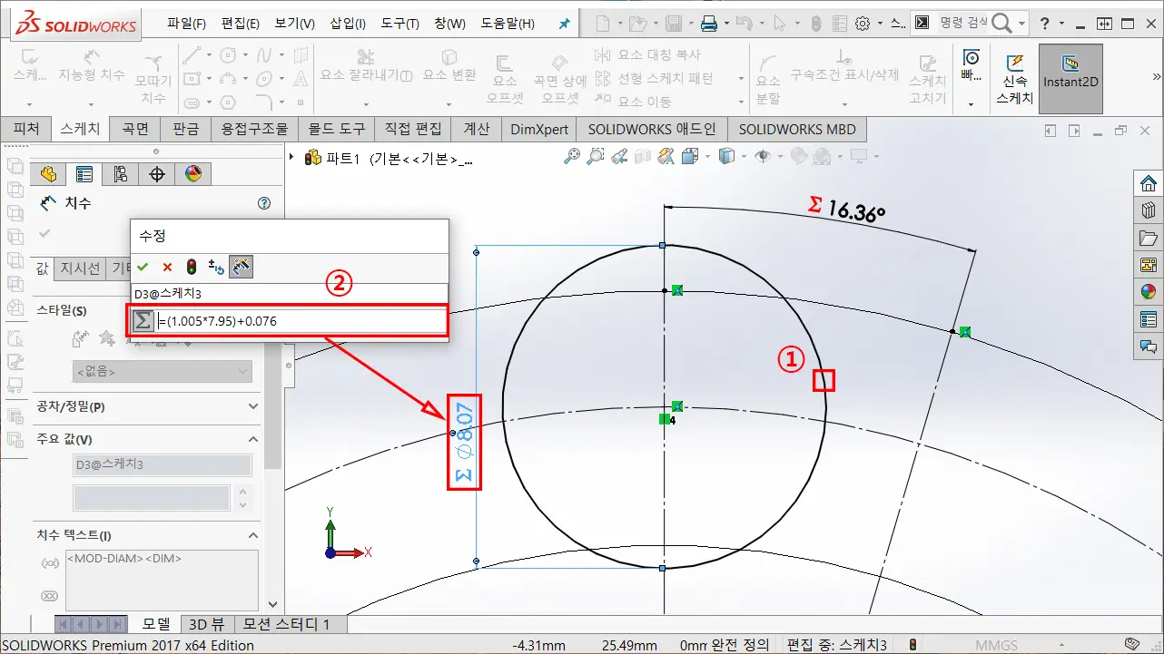 ③ 스프로킷 기준 치수에서 중요한 스프로킷 휠 표준 외경(Do)에 해당하는 공식을 대입하여, 지름 치수 구속 값을 입력한다.