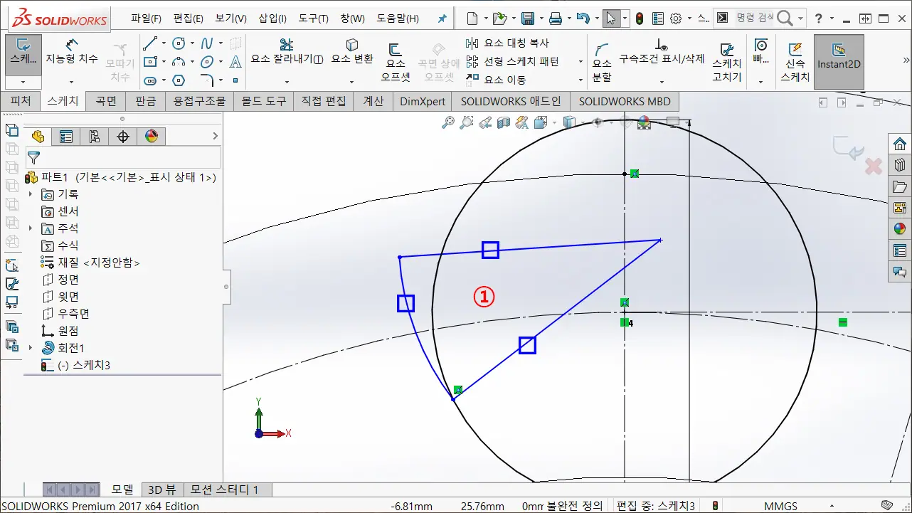 ① 스케치 선으로 c-y 및 c-x 연결 선을 작성하고, 스케치 3점 호로 x-y에 대략적으로 호를 작성한다.
