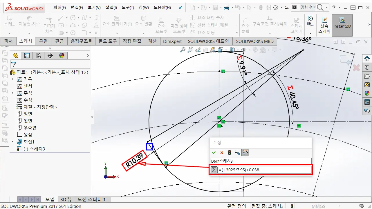 2-9까지 각도 구속을 완료하고, 공식 E에 해당하는 반지름으로 구속한다.