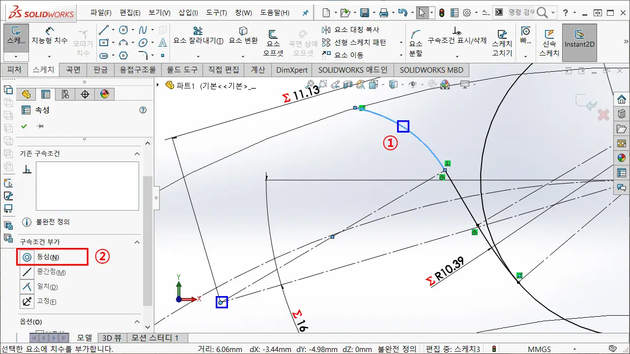 ② 구속조건 부가에서 동심을 선택한다.