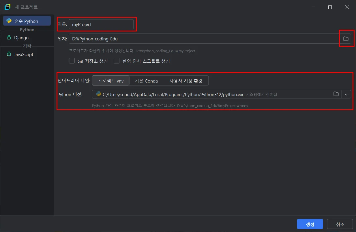 ※ 그리고, 영어로 이름을 지정하는 버릇은 틈틈이 만들어 두는 것을 엄청 추천한다. 공부하다 보면 안다. 이름 정하는 것이 코딩하는 것보다 어렵다는 것을.ㅠ - 인터프리터 타입은 기본 프로젝트 vnv로 설정하고, Python 버전은 파이참 설치 전에 먼저 설치한 파이썬 인터프리트가 자동으로 감지되어 리스트에 나타난다.