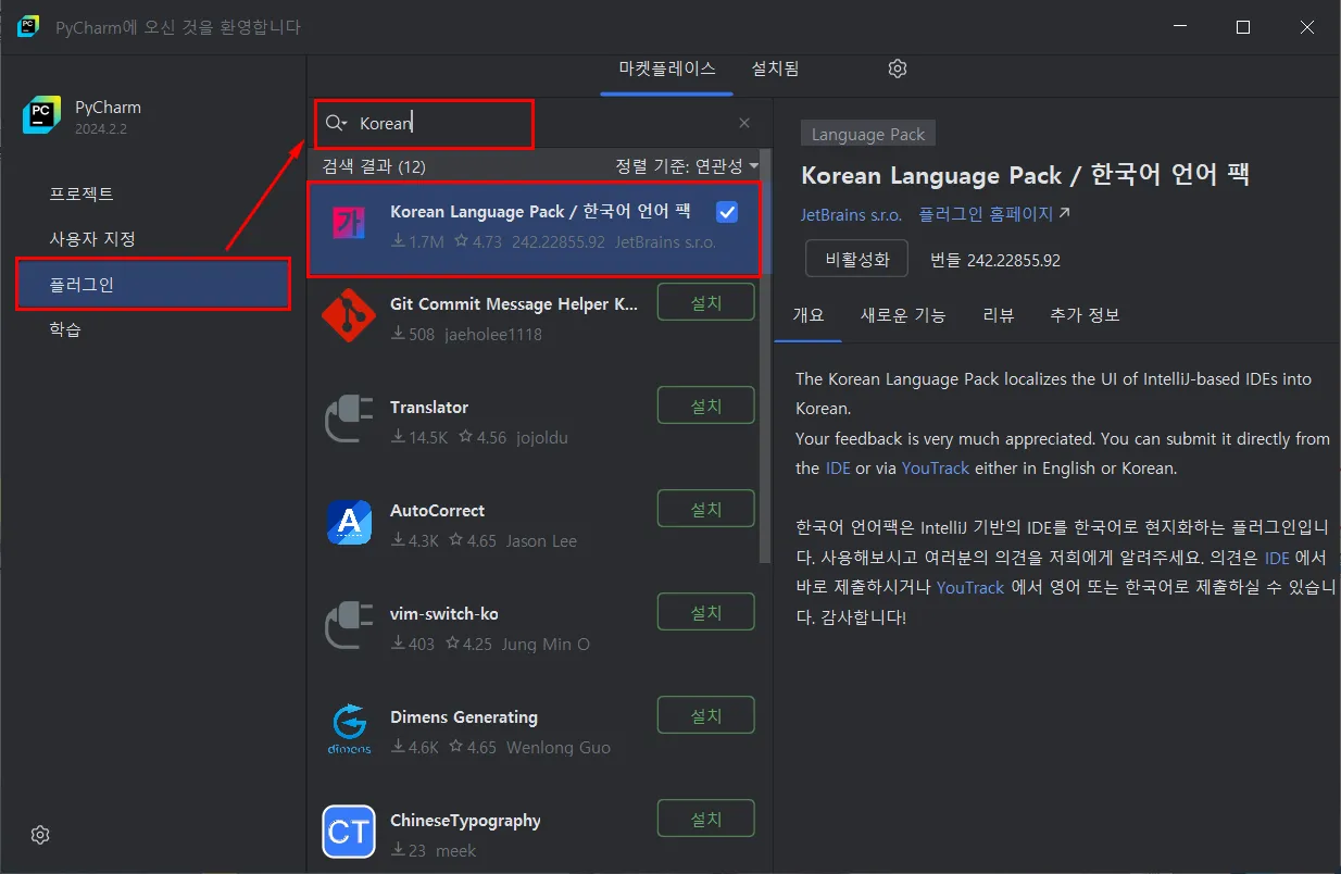 사용자 지정에서 한국어 항목이 없는 경우가 있다면, 바로 아래에 있는 Plug-in(플러그인)을 클릭하고, 검색에서 korean을 타이핑하면 Korean Language pack 항목이 나타나며, 해당 한국어 언어 팩을 설치하면 한글로 된 인터페이스로 변경이 된다.