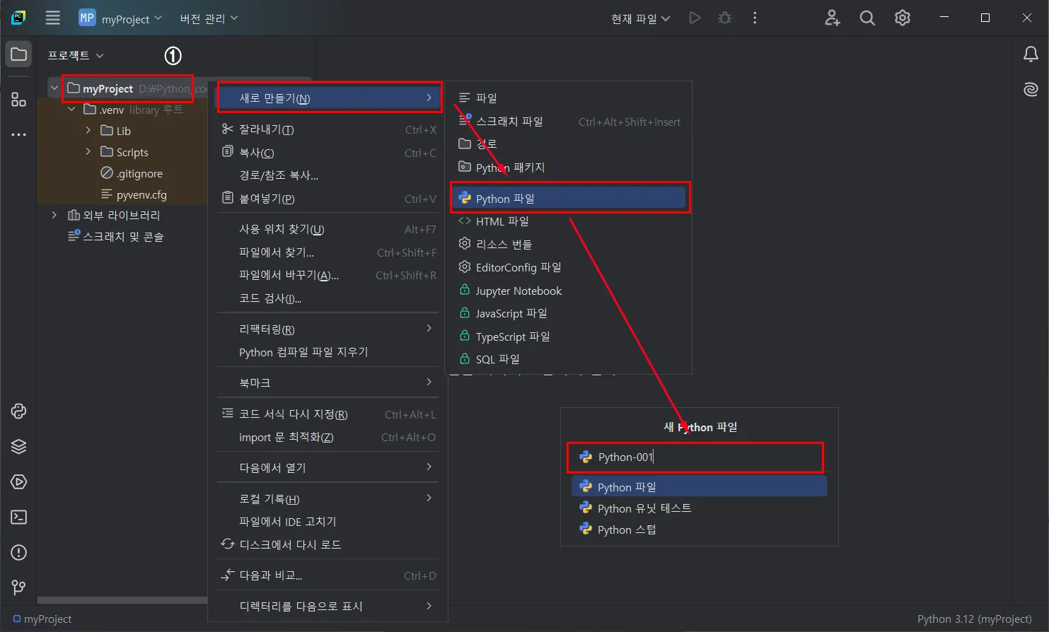 - 프로젝트 창에서 프로젝트 이름에서 마우스 우측 클릭해서 나오는 드롭다운 메뉴에서 새로 만들기 -> Python 파일 클릭 -> 새 Python파일에서 사용할 파일명을 입력한 후, 엔터를 누르면 자동으로 파일이 생성된다.