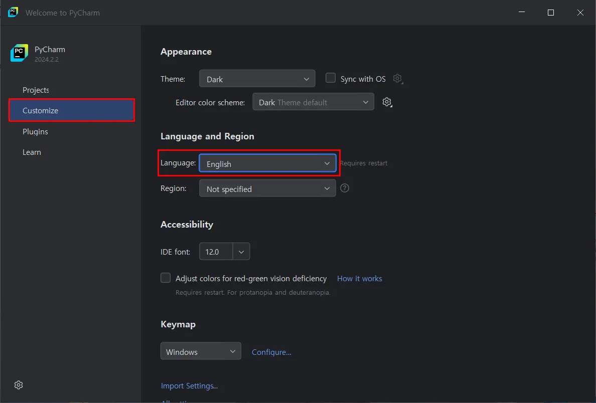 지난 시간에 설치한 파이참을 실행해서 외쪽에 있는 카테고리에서 Customize를 선택한 후, 설정 창에서 Language에서 기본값으로 되어 있는 영어를 클릭해서 한국어로 선택하면, 파이썬을 다시 시작하라는 메세지를 통해 다시 시작하면 파이참 인터페이스가 전부 한글로 변경되는 것을 확인할 수 있다.